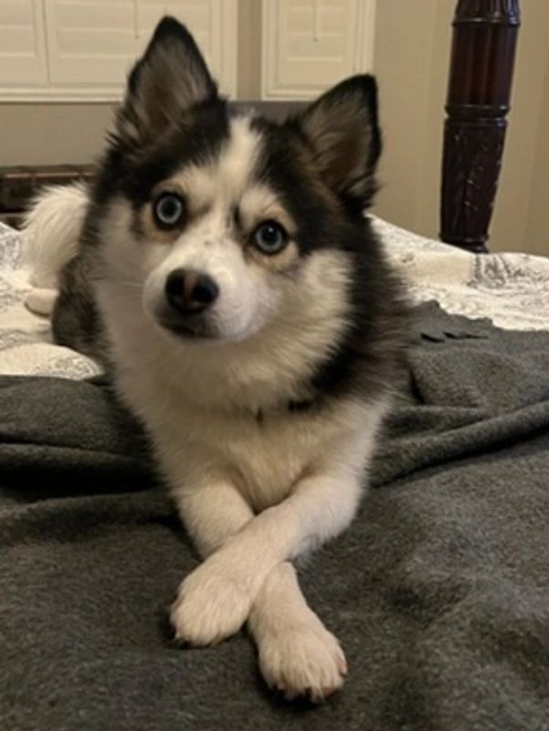 Female F3 Pomsky, black and white coat, husky mask. Blue eyes